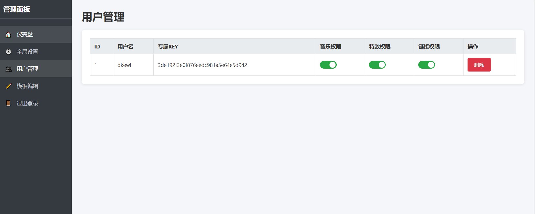 3、权限控制:后台可以精细化管理每个用户。看谁不爽?直接把他账号删了,觉得某个用户太跳?可以一键禁止他使用音乐、特效或者生成分享链接的功能。